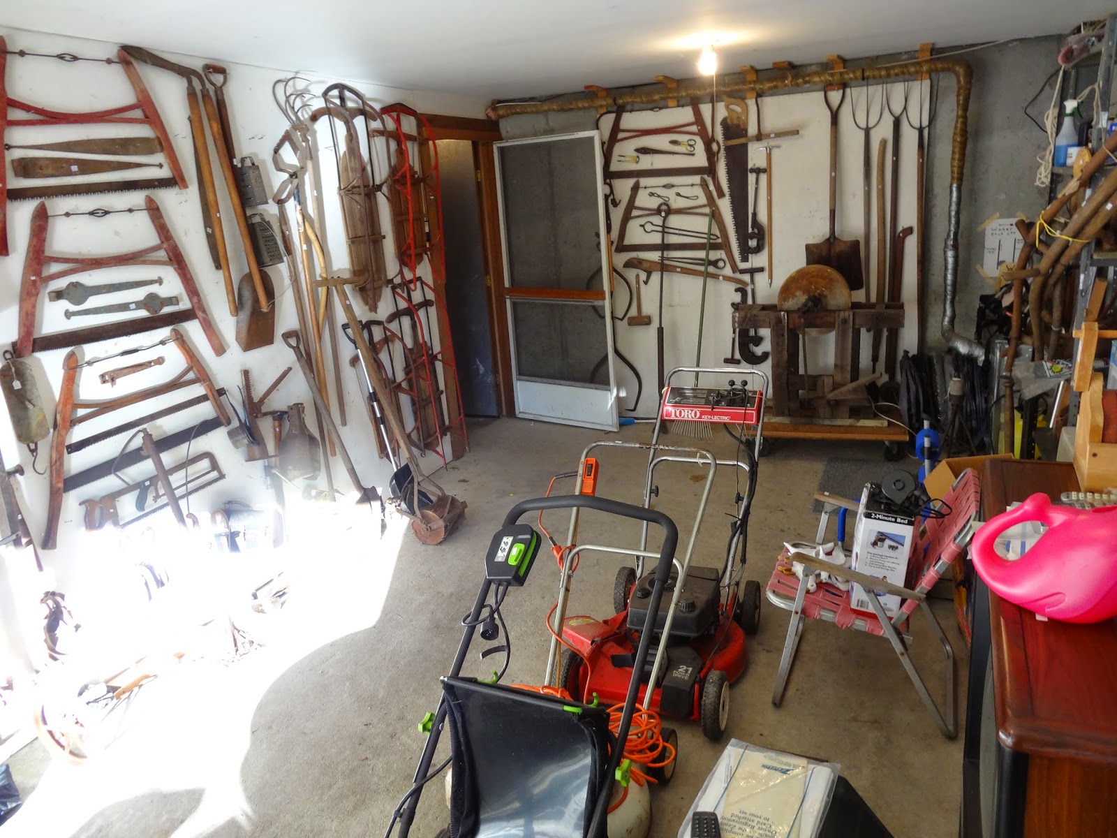 Also lamps, prints and paintings a garage full of antique tools, owl andirons, coffee grinder and other smalls. Power and yard tools, wheelbarrows, grinding stones, electric lawnmowers, kitchenware, bed linens, small women's clothes.